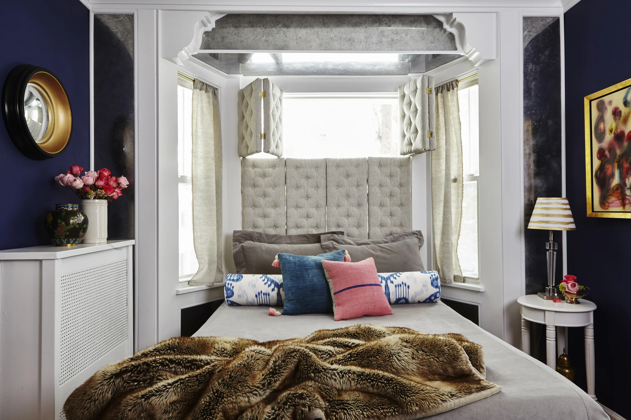 Ok??? She's all kinds of alllllllright...so much PJ DIY yummy is happening in here y'all. That 'mercury glass' wall feature? That's actually just clear plexiglass treated to look like mercury mirror-- YASSSSSSS! Tutorial here. The tufted shutters as headboard situ & the upholstered box spring w/brass nailhead detail and added legs are more PJ DIY projects that turned out quite beautifully which I'll be posting the tutorials on those soon...