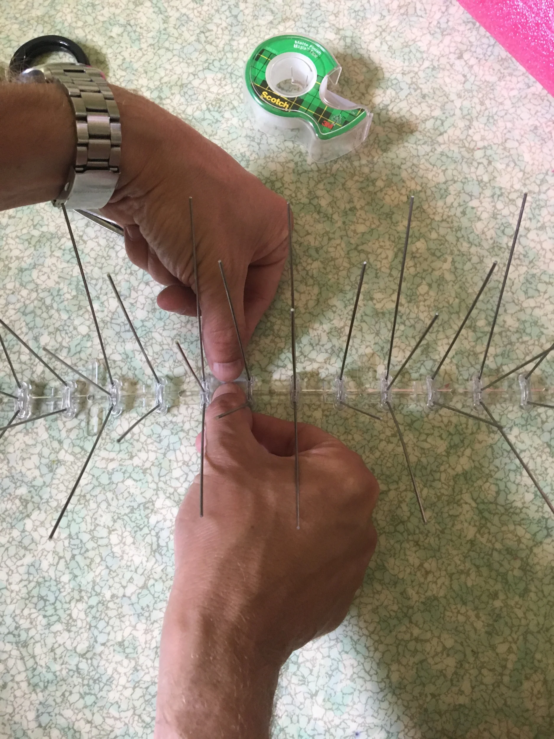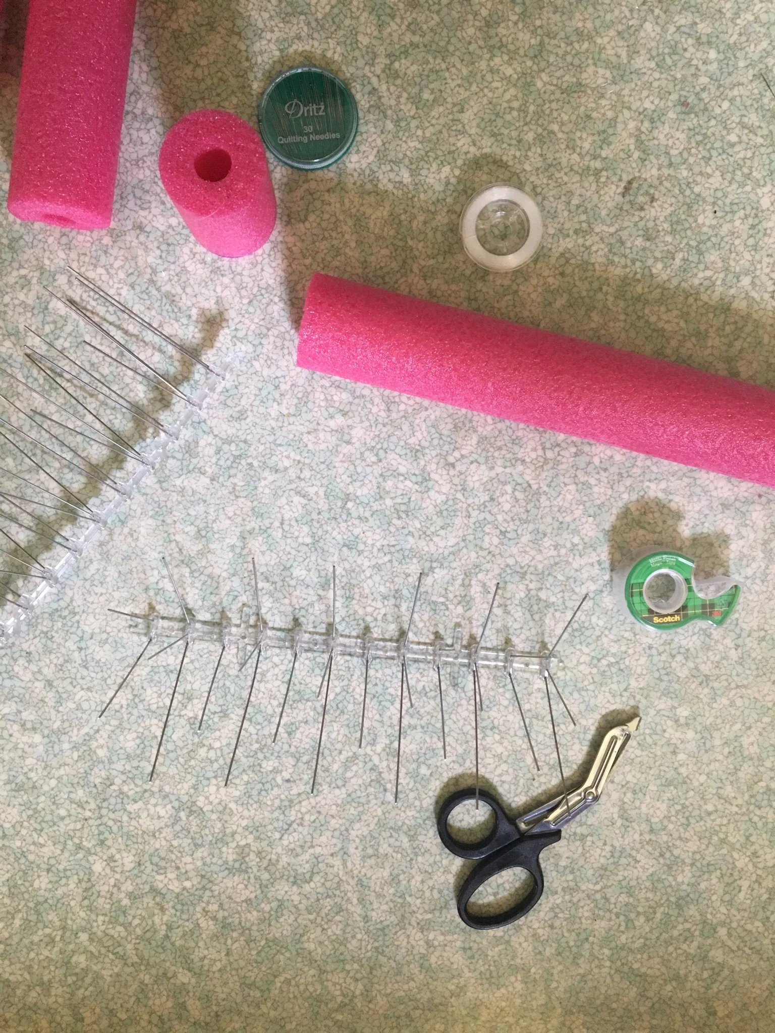 Tape two (or more) sections of bird spikes together to get overall length. Should be the same length as your pool noodle piece. The tape is temporary and only needed to secure two or more sections of bird spikes together whilst you cut your length & to sew the spike section in place.