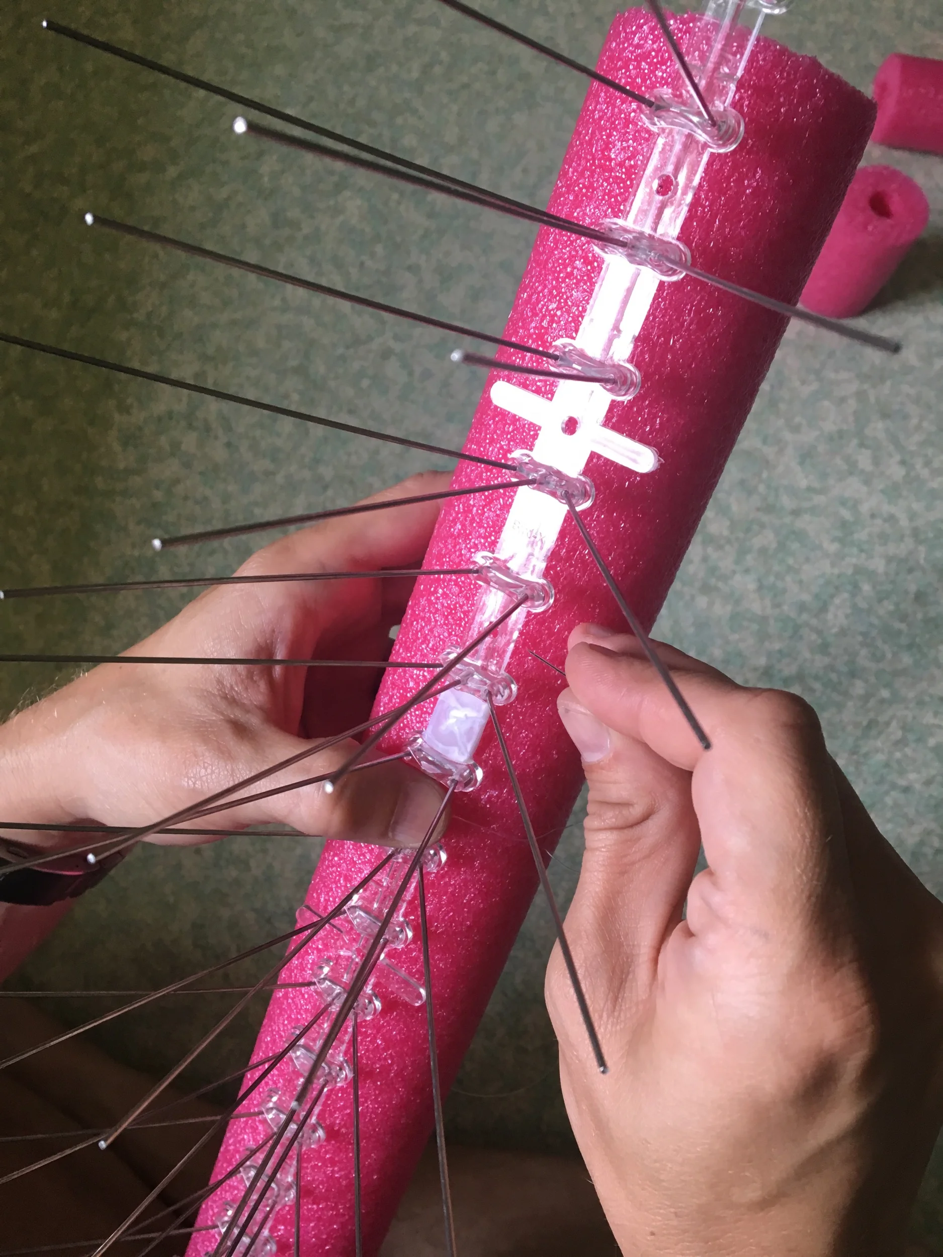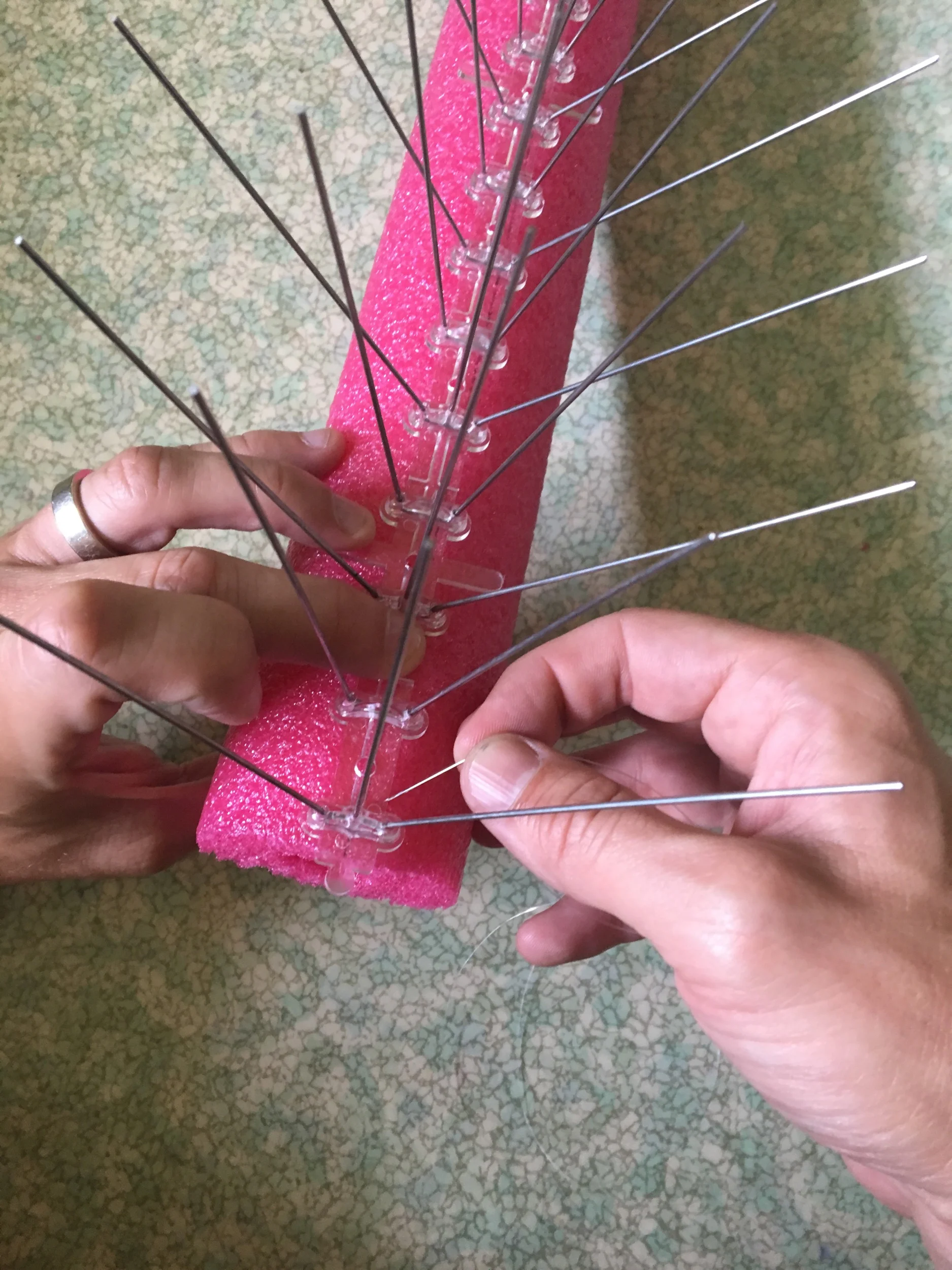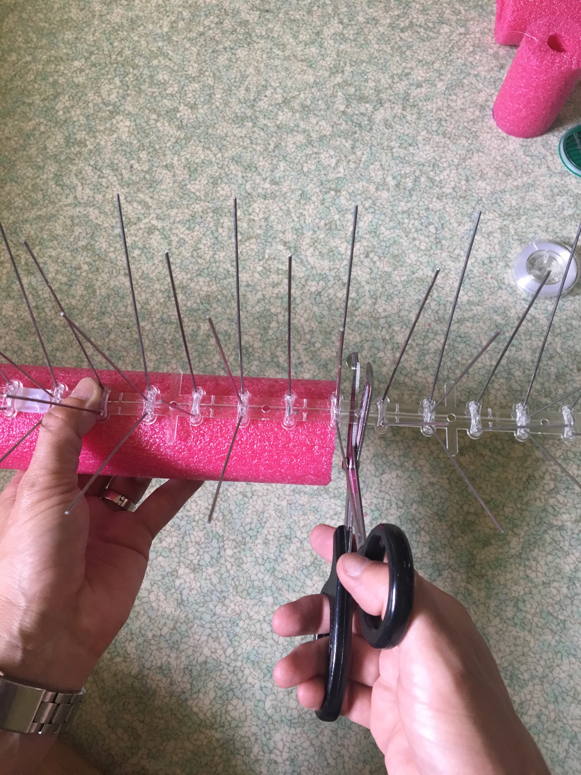 Hold your section of spikes on your noodle & carefully begin to sew in place using fishing line and a quilting needle. You are sewing this section on the opposite side of your earlier cut. This step is more tedious than it is difficult. This is basic needle and thread action here, nothing fancy folks. But keep in mind you are sewing into foam, so unlike fabric, you need to use a lighter touch when poking needle through completing your passes, pulling taut, etc. And look carefully below, there are pre-manufactured holes in the plastic on the bird spikes, so this is what you’re sewing through/into pool noodle.