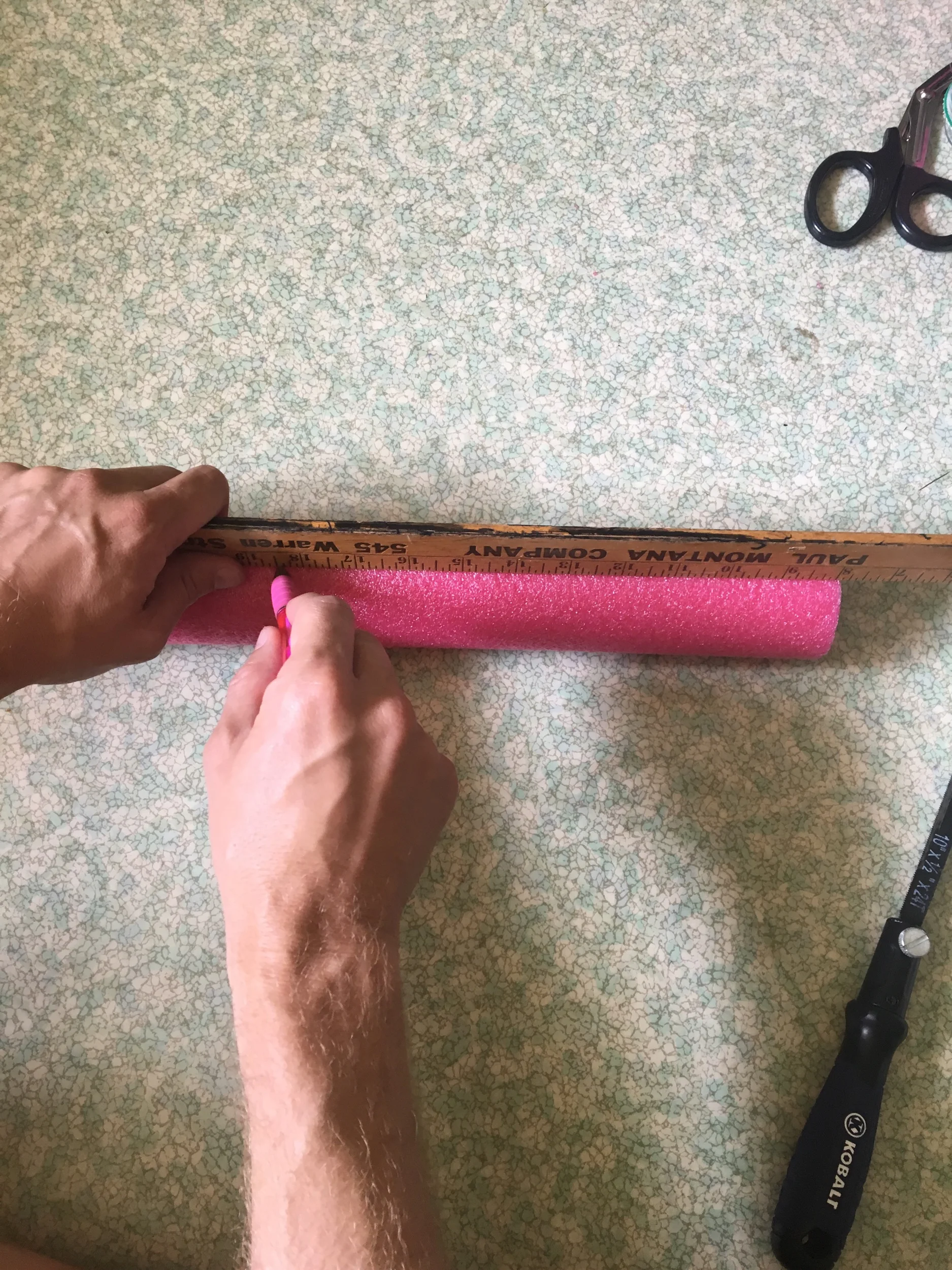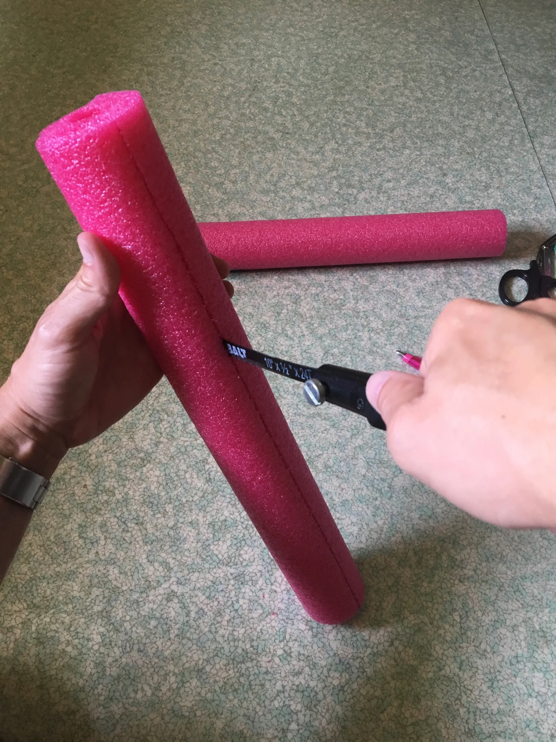 Measure the length of chair back and trace a straight line on pool noodle using pen and yard stick: